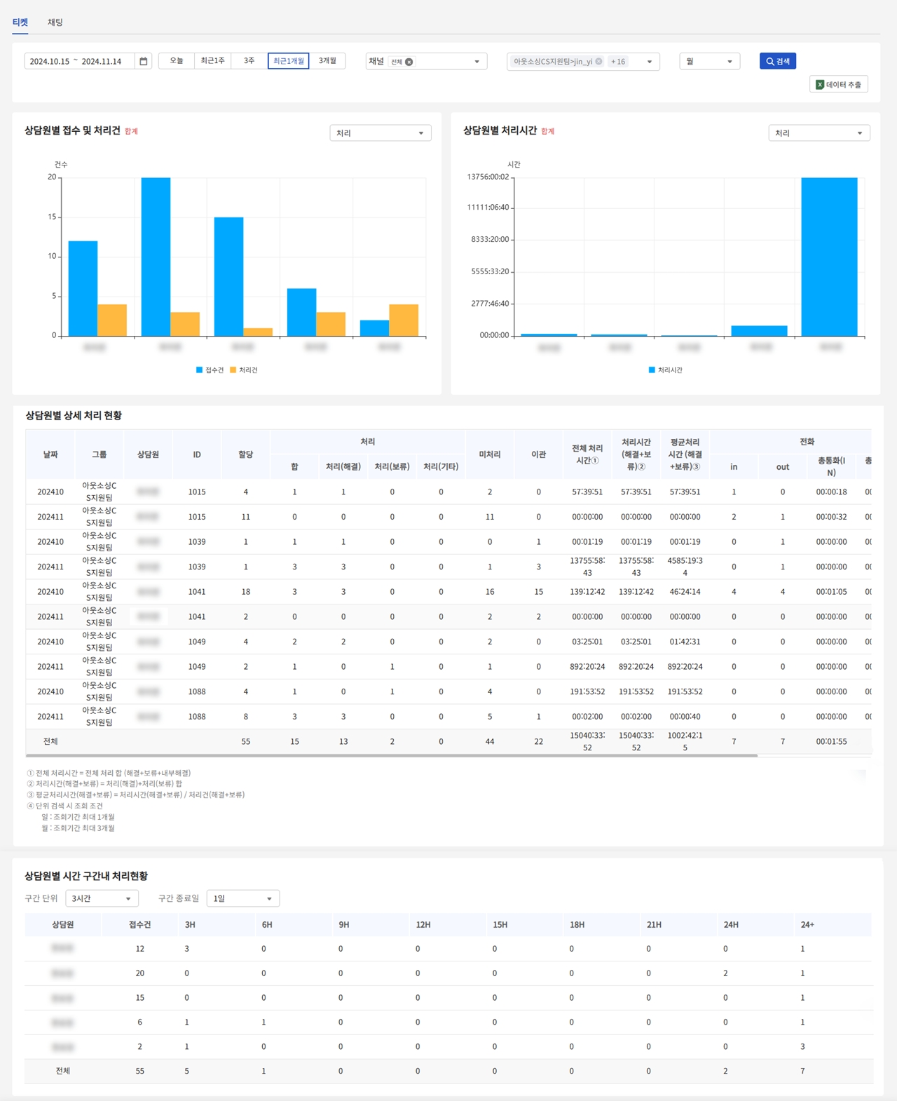 설정한 조건에 따른 상담원별 상세 처리 현황 표입니다.