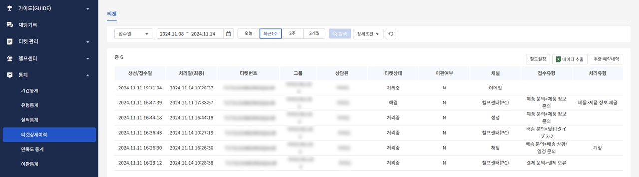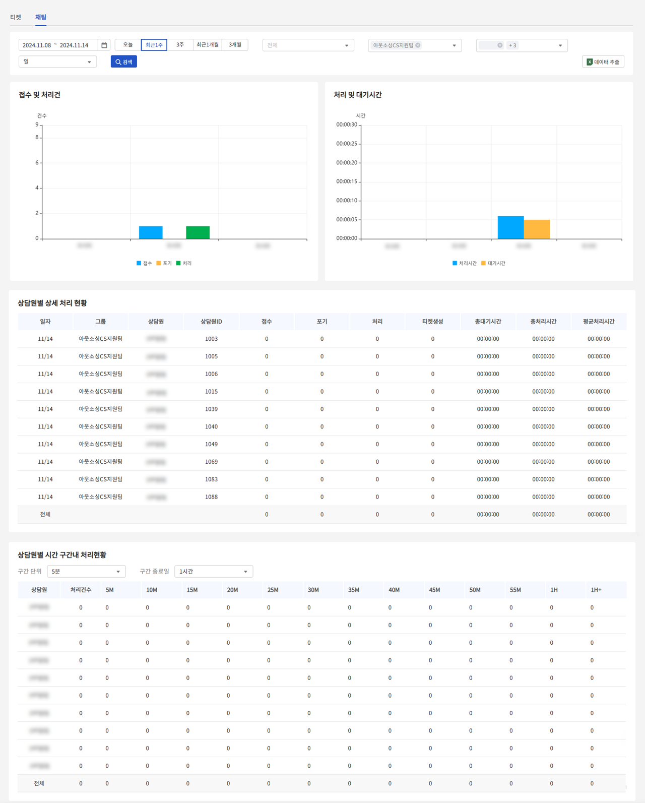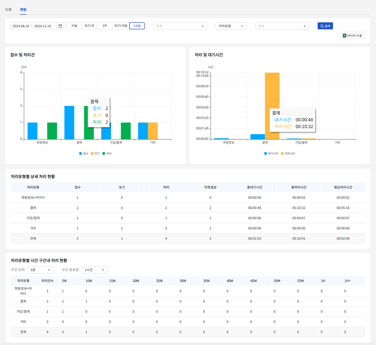 설정한 조건에 따라 처리유형별 접수 및 처리 건, 처리 및 대기시간을 조회할 수 있습니다.
